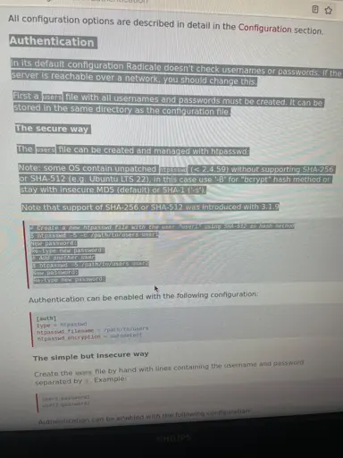 But I think I’m understanding a bit! I need to literally create a file named “/etc/radicale/config”. Then after that I need to copy/paste the configuration file/command line into said folder. Once I do that then I should be able to move onto authentication and then addresses.