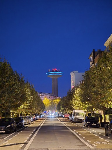 Edit: it’s this Gower, the article has a daylight picture. https://fr.wikipedia.org/wiki/Tour_ReyersSeems you’re right, its a communications tower. Saucer is for the view in any case.