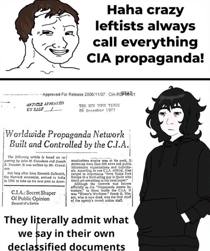 ☆ Yσɠƚԋσʂ ☆@lemmy.ml to Memes@lemmy.mlEnglish · 2 days agoHaha crazy leftists call everything CIA propaganda!lemmy.mlimagemessage-square1fedilinkarrow-up1100arrow-down11