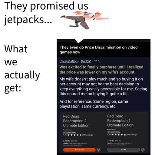 Except they shouldn’t be price discriminating; it’s easier and more effective to just offer tiered pricing structures (e.g. collectors editions) and eventual sales (e.g. 50% off after a year) to hit people at different places on the supposed consumer surplus curve. As you note, the undermines your confidence in the prices but you’re likely a little lower on the curve compared to the “must have on day one” crowd.