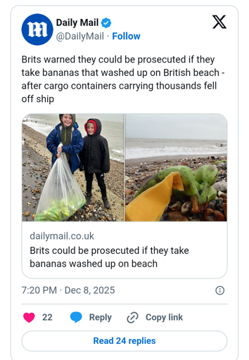 I don’t know anything about British courts, but I doubt that any court is going to find anybody guilty of any major crime for collecting bananas washing up on the beach, for which the corporation that lost them got an insurance settlement to cover the loss. That’s salvage, and salvage rights are long established.