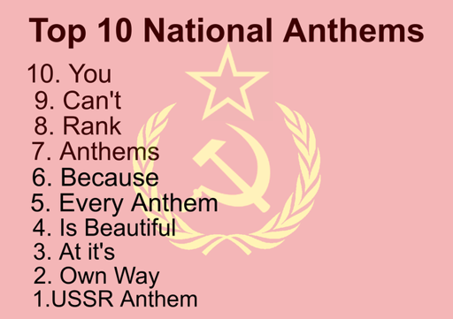 minus-squareGeodes_n_Gems@lemmy.mllinkfedilinkarrow-up6·7 days agoAll National Anthems are equally great, just some are more equally great than others.