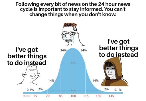 Most importantly, as I called out in my first fucking sentence of my last comment responding to you, it’s a massive fucking false dichotomy. It is entirely possible to stay informed and up to date on events without fucking wallowing in the nonstop deluge of “sky is falling” headlines.