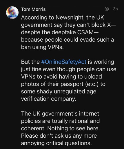 minus-squareIcyToes@sh.itjust.workslinkfedilinkEnglisharrow-up27·4 days agoTruth is likely, they want to know who you are when browsing but have no backbone to go after any large tech company. I wonder how many people care enough to use VPN just to access Xitter.